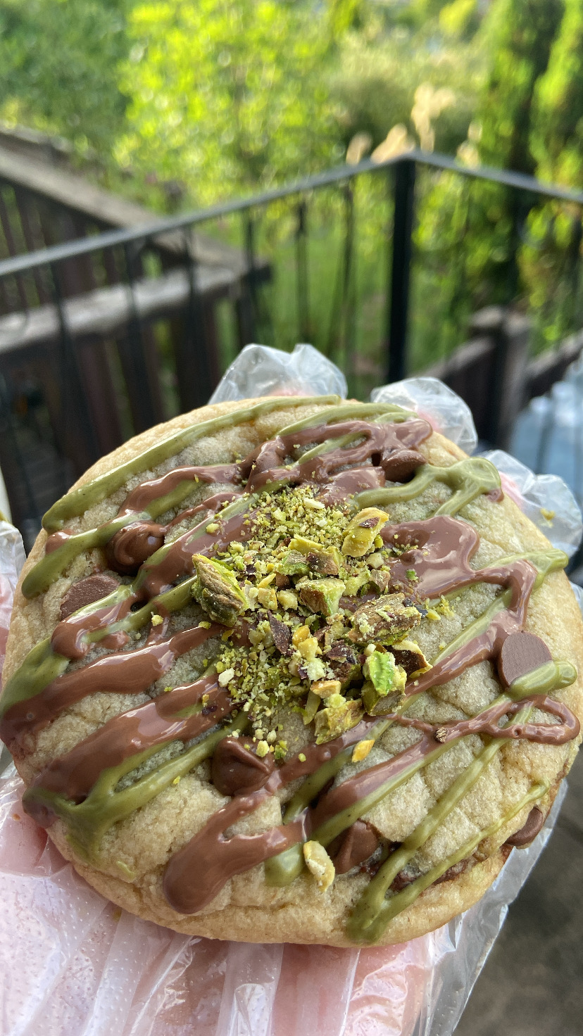 Soft-baked chocolate chip cookie with a pistachio and hazelnut center. Each cookie is drizzled with pistachio sauce and smooth milk chocolate, creating the perfect harmony of nutty, chocolatey indulgence in every bite. A decadent twist on the classic cookie — rich, satisfying, and utterly unforgettable.